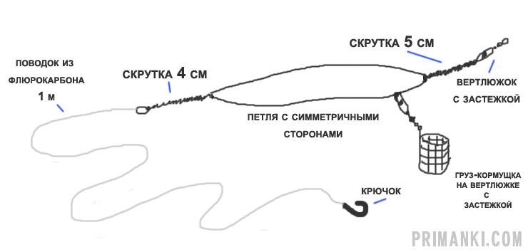 - Теперь про оснастку – многие используют «антизакручиватель» и «патерностер», они хорошо себя показывают на водоемах с илистым дном, но если есть желание получить самую чувствительную оснастку то это: симметричная петля.