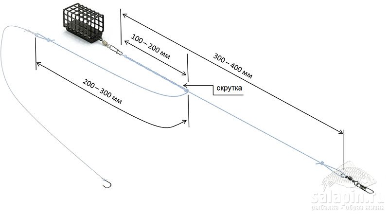 Порядок вязания монтажа описан в предыдущем пункте. Часто с такой оснасткой применяют подсадку пенопласта на крючок, в этом случае поводки ставят такой длины, чтобы шарик парил над кормушкой, раздражая подошедшую к прикормке рыбу.