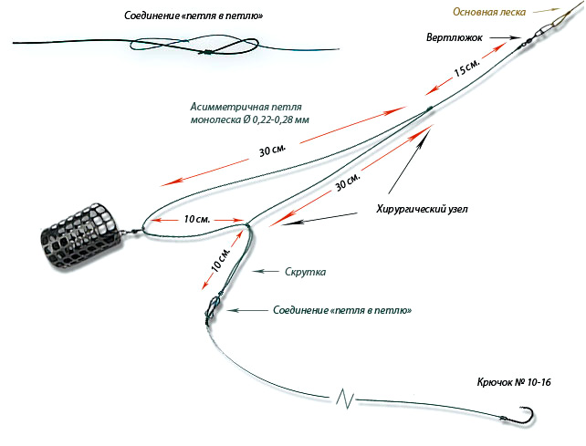 Асимметричная петля считается лучшей оснасткой для фидерной рыбалки на течении. Здесь учитываются все нюансы работы элементов в одном потоке.