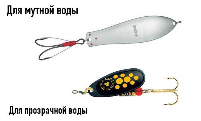 - Если в водоеме вода имеет мутный оттенок. То лучше всего подбирать блесну с характерным усиленным блеском.