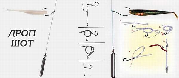 - Снасть дроп-шот. Отличие данного способа от других – расположение наживки и лески на разных плоскостях. К концу лески крепится грузик и вяжется узел с крючком, на котором фиксируется резиновая наживка.