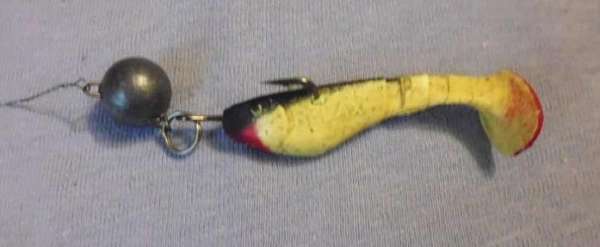 - Ловля на резину с использованием отводного поводка очень простая по конструкции. Может применяться на любом виде водоема. Длина поводка не менее 100 см. При использовании небольших по размеру и весу приманок, применяется дополнительный груз, в качестве которого могут выступать небольшие свинцовые дробинки.