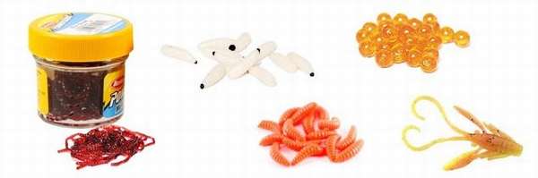 - «Съедобные» приманки – широко применяемый и распространенный вид. Используются для ловли рыбы независимо от времени года. Выполняется из резины с примесями аминокислоты. Для привлечения хищной рыбы материал пропитывается аттрактантом, который значительно повышает интерес к приманке. Основной недостаток – низкий порог прочности. Порой одна поклевка может повредить наживку до такого состояния, что ее необходимо будет менять.