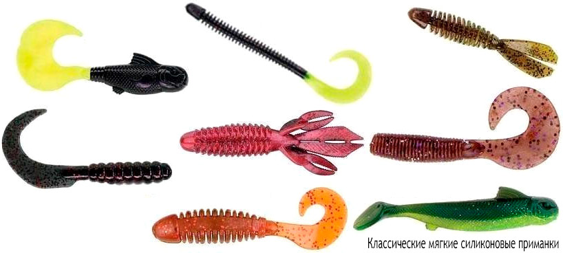 Силиконовые приманки Этот тип приманок получил широкое распространение в нашей стране (и огромную популярность среди спиннингистов) относительно недавно, и единства в терминологии нет: одни рыболовы называют их «резиновыми приманками», другие «мягкими пластиковыми