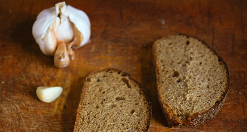 Берется свежий ржаной хлеб. Корку натирают чесноком, в мякише делается ямка, которая потом заполняется растертым чесноком.