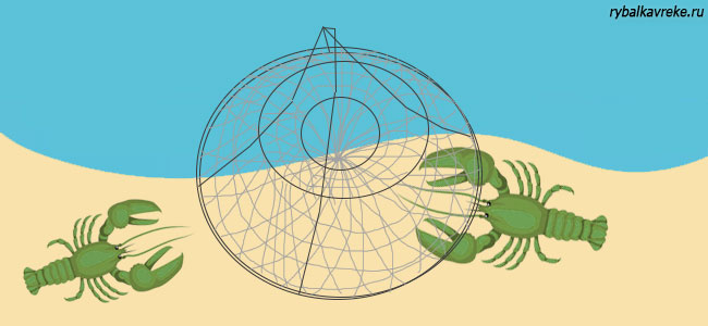 При ловле на большой территории водоема применяют длинные со множеством входов рачевни. Их подготавливают на берегу и уже потом закидывают на дно.