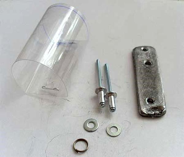 Теперь груз приклеивается к стыковому соединению каркаса, отклеивается от грузика скотч, после чего сам он прикладывается к пластику и крепко прижимается. В конечном итоге нужно будет подготовить скрепку для крепления, проделать в кормушке несколько отверстий и соединить все скрепкой.