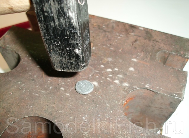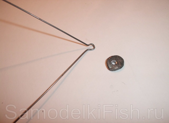 Ввиду того, что крючок имеет свой вес, то следует сбалансировать колебалку незацепляйку каплей свинца возле заводного кольца. Расплескиваем свинец и делаем в нем отверстие диаметром 2 мм.