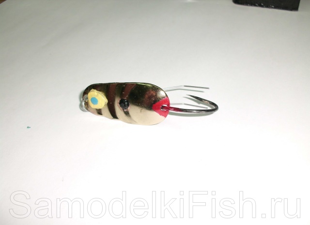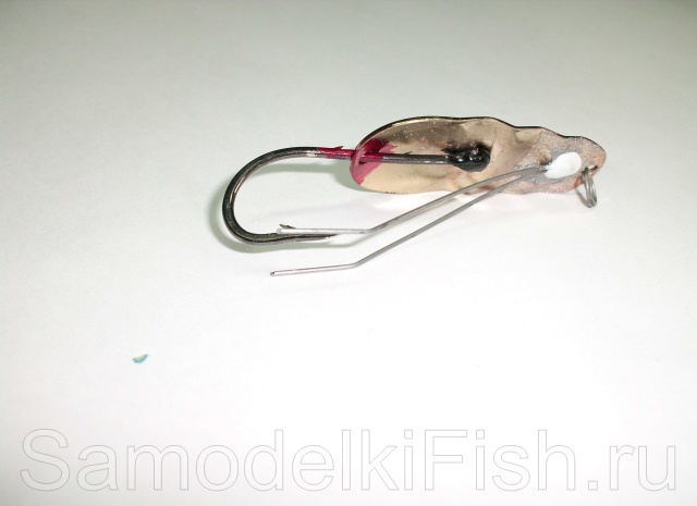 С тыльной стороны – переднюю часть блесны покрыл прозрачным лаком с блестками, а на винте для усиков, предохраняющих от зацепа, сделал белую точку.