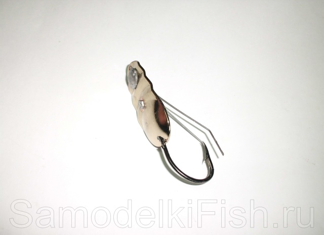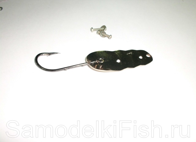 В полученной заготовке высверливают отверстия для установки заводных колец под крепление карабина и крючка. В некоторых модификациях самоделки понадобится высверлить лишь одно отверстие в передней части лепестка, так как крючок будет на припое жёсткой сцепкой соединён с телом блесны.