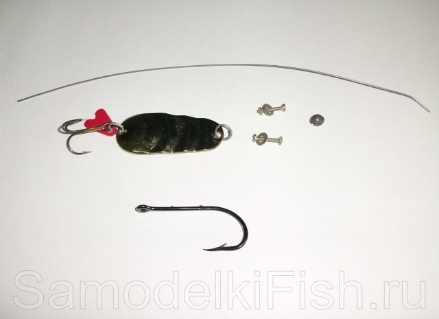 Итак, берем недорогую, но уловистую блесну (в моем случае, это дешевая польская колебалка, получившая в народе прозвище «стиралка»), одинарный крючок, два винтика М2 с гайками, однограммовый грузик и отрезок тонкой стальной проволоки.