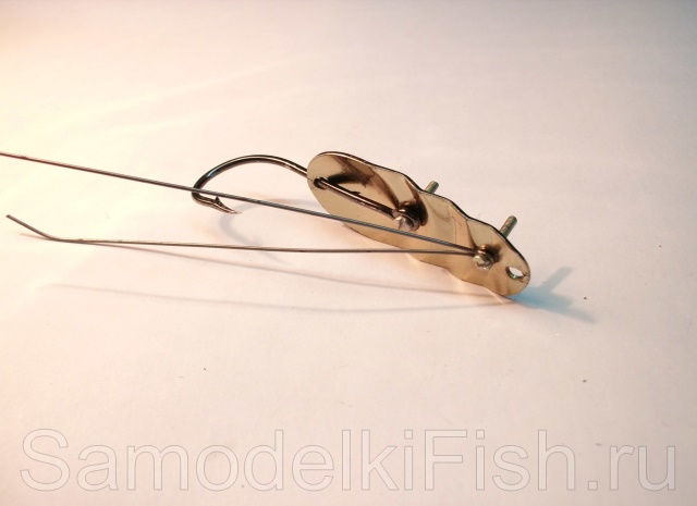 Жала крючков на1-1,5 мм должны выступать из прорезей пластинки. Чтобы пластинка не смещалась в сторону блесны, ее следует зафиксировать кусочком велосипедного ниппеля, надетым на цевье.