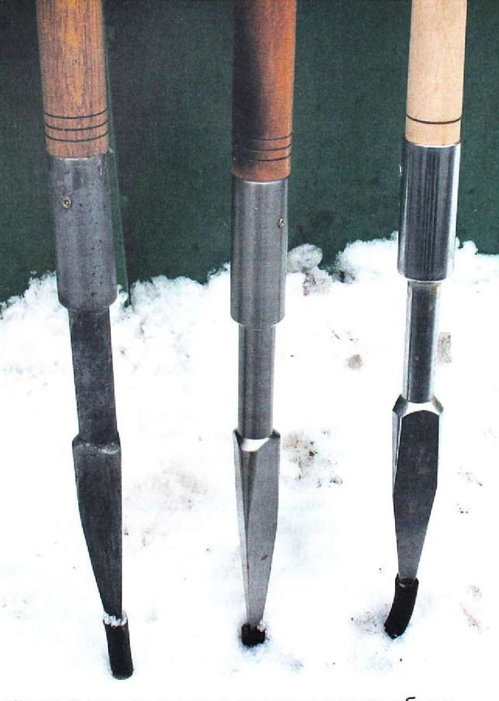 Стамескоподобная пешня характеризуется наличием одной или нескольких граней, находящимися параллельно по отношению к продольной оси черенка. Такое приспособление позволит сделать лунку с вертикальными отвесными стенками.