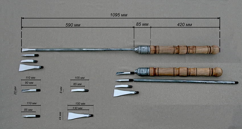 При составлении чертежа нужно обратить внимание на вид пешни, которую предстоит делать. Богатая рыболовная история позволила рыбакам перепробовать множество разных видов и вариаций этого инструмента. Речь идёт в первую очередь о виде наконечника, так как он играет решающую роль в пробивной способности пешни.