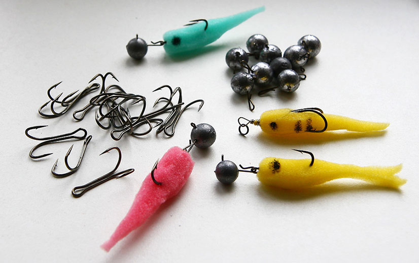 Монтаж поролонки можно производить на разных крючках, это могут быть двойники, тройники или одинарные офсетные крючки. А вот, что касается джиг головок, то лучше применять шарнирное соединение, для обеспечения максимальной подвижности приманки.