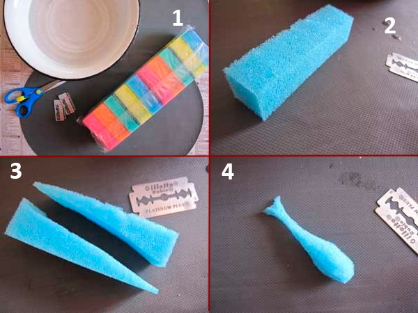 - Из поролона аккуратно вырезается основа в виде рыбки или просто усечённого конуса. Затем вдоль детали формируют канцелярскими ножницами надрез.