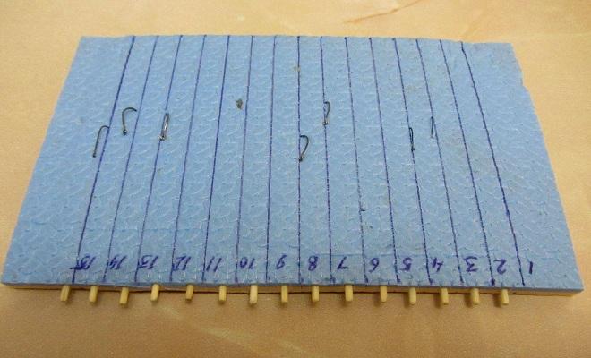 Далее наматываем поводки на булавки. Можно делать несколько оборотов. Крючки вонзаются либо в поролон, либо надеваются на булавки.