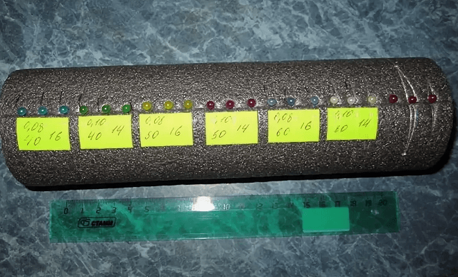 После этого с определенным интервалом стоит вставлять по одной булавке (их количество будет зависеть от ширины изоляции или поролона). Нужно выбирать такие булавки, чтобы они протыкали картонную трубку, в противном случае они попросту могут выпадать оттуда. К шляпкам булавок будут крепится петли поводков.