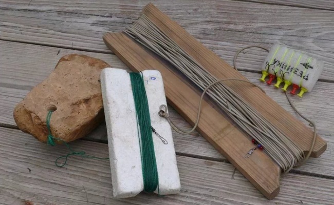 - Основная леска наматывается на катушку (мотовильце) с необходимым запасом. Для крепления мотовильца на берегу необходимо подготовить надежный колышек. Кроме того, еще один кол (или рогатина) потребуется для временной фиксации лески при ее вытягивании на берег для проверки наживки или снятия добычи.
