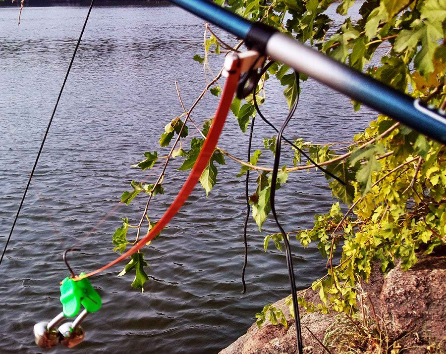 Резиновый шнур должен немного оттягивать леску. Во время поклёвки леска натягивается, и колокольчик начинает звенеть.