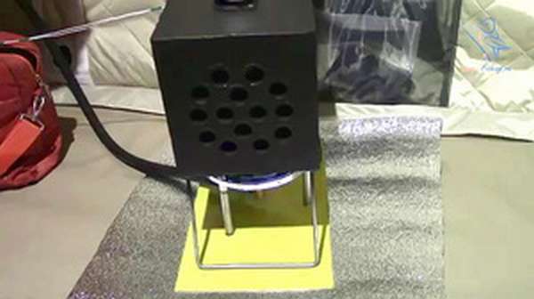 Снизу размещается печка/горелка, подключается газовый баллон, поджигается газ, а затем включается кулер. При первых запусках, возможно, будет ощущаться неприятный запах, но через 10−15 минут работы он исчезнет.