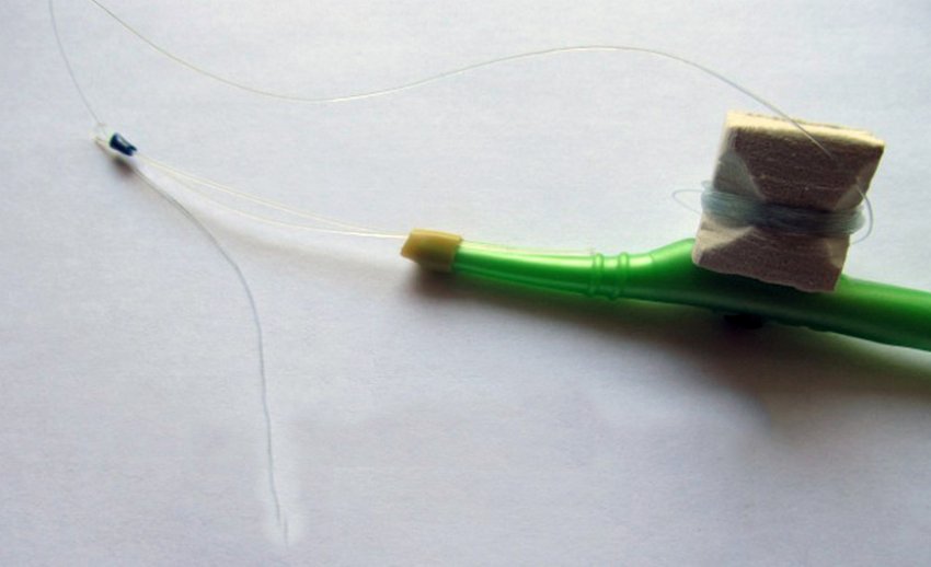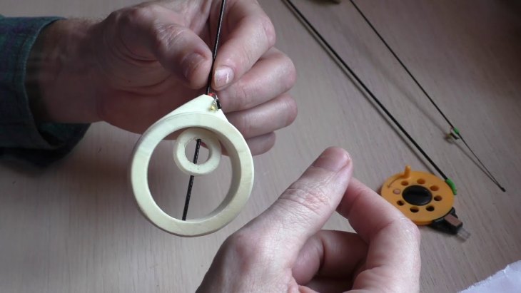 - На заключительном этапе, на пенопластовую основу, по желобку, наматывается леска. Ее следует пропустить через отверстие кивка. После этого к леске крепится приманка, что указывает на готовность снасти к применению.