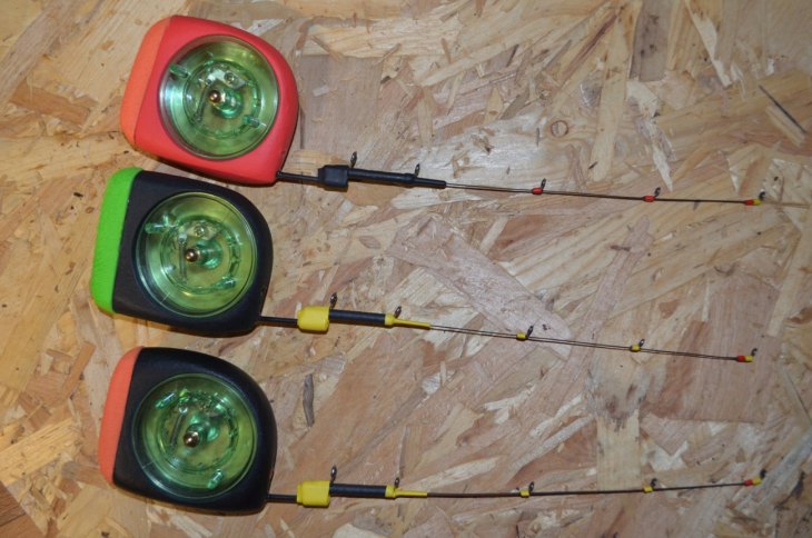 При оснастке поплавком удильник можно просто класть на лед рядом с лункой при ловле. Но для кивковых монтажей хлыстик размещается прямо над лункой для правильного положения сторожка.
