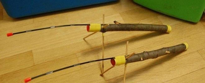 - Берется две крепкие ветки средней длины: одна — прямая, другая — рогатая. Также вместо ветки-рогатки можно использовать большую деревянную шпулю.