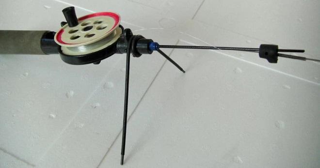 - Кивок. К самой тонкой части удилища крепится кивок. Это наиболее чувствительная часть удочки. Может быть изготовлена, например, из пружинки. Вдоль узкой части удилища и через кивок проходит леска от катушки.