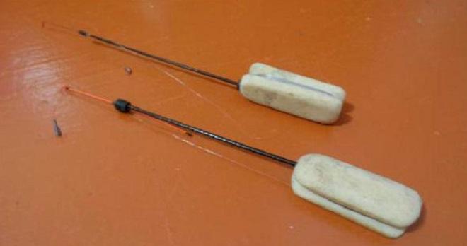 - На конце кивка нужно проделать отверстие, чтобы через него можно было пропустить леску. Это делается разогретой иголкой. После того, как отверстие сделано, место обрабатывается мелкой наждачной бумагой, чтобы устранить наплывы.