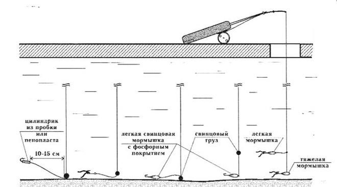 В зависимости от условий ловли и вида рыбы применяются различные зимние монтажи, с кивком или поплавком. Поплавочная оснастка настраивается так, чтобы при подъеме крючка с подпаском (мормышки) от дна рыба не чувствовала вес приманки.