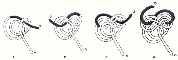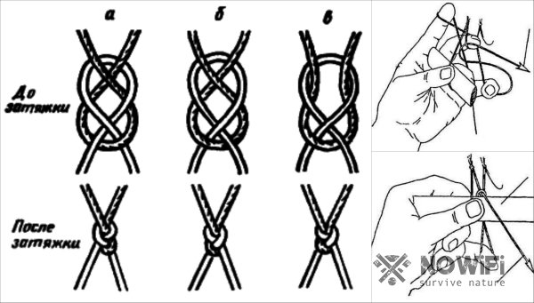 Если подходящую операцию повторить несколько раз, получатся следующие узлы. Они же затем прочнее затягиваются для обеспечения большей надёжности.