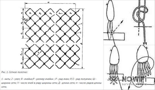 Вязание сетного полотна — это многократно повторяющиеся операции по завязыванию и затягиванию узлов, с помощью которых к верхнему ряду ячей подвязывают нижний ряд полуячей.