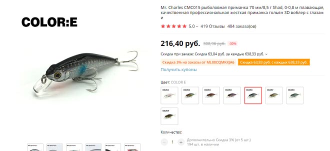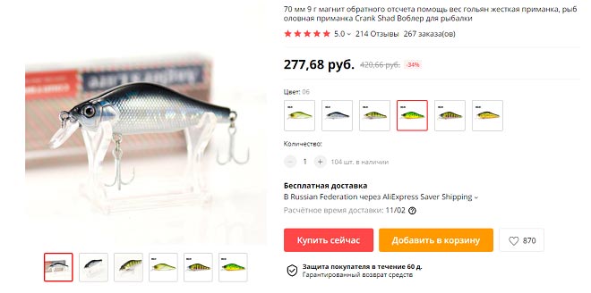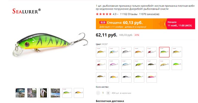 Рассмотрим на примере страницы реплики от Sealurer за 62 рубля (кстати, проверенной и рабочей) на воблер YO-ZURI L-minnow 66. Стоимость оригинала при этом – более 500 рублей плюс 300 р.