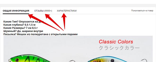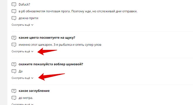 Ищем раздел Вопросы к продавцу – это сразу под отзывами. Вот тут покупатели обычно и пишут то, что нам интересно – работает ли воблер, кто разловил и при каких условиях, заглубление и характеристики, рабочие цвета. Прочитав этот раздел, становится понятно, стоит ли покупать этот конкретный воблер, или нет.