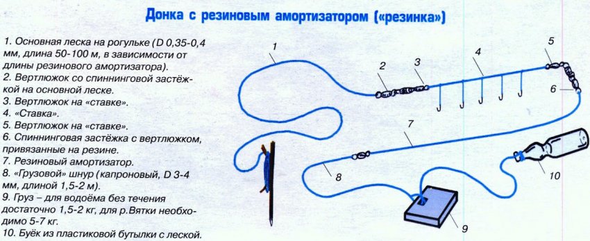 Резинка возвращает леску на прежнее место. Крючки на донке размещены на разном расстоянии с различными насадками.