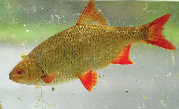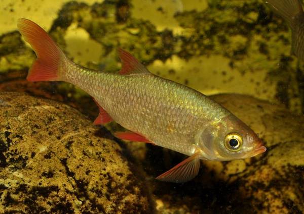Scardinius erythrophthalmus – по сути красноперка обыкновенная, встречается во многих водоемах Европы, средняя ее длина до 25 см, а вес до 400 г. Эта рыба весьма популярна среди рыбаков-любителей.