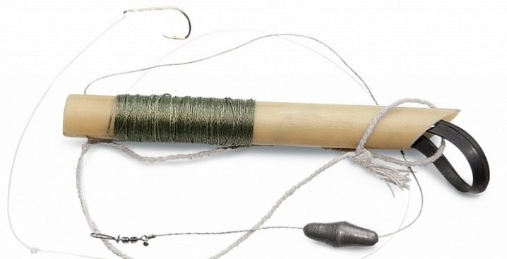 - на трубу наматываем 15 м лески. Свободный конец лески пропускаем через отверстие скользящего грузила весом 15 г. Последнее стопорим резинкой. На конце лески крепим вертлюжок для поводка;