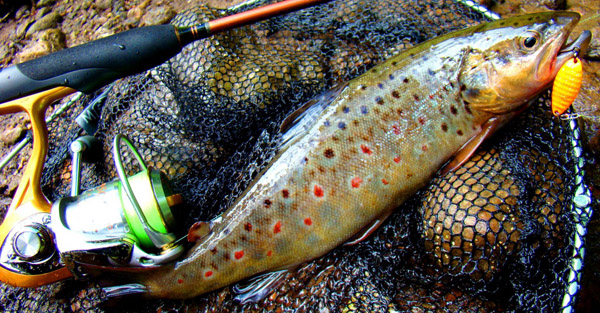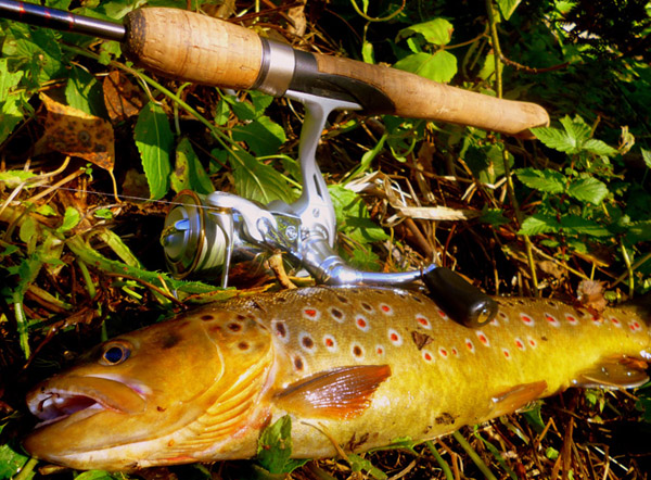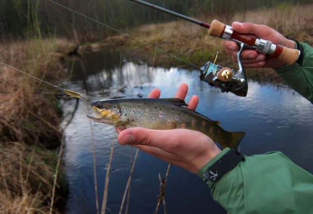 Рыбалка на ручье или реке со спиннингом для блеснения и ловли ручьевой форели очень активный и подвижный вид ловли. При поиске форели приходится заходить в холодную речку или пробираться через кусты и деревья по берегу и при этом периодически закидывая блесну или воблер, облавливая места возможного нахождения форели.