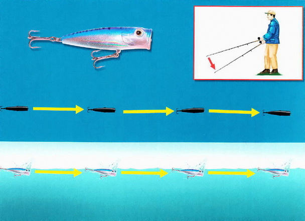 Базовая проводка поппера выглядит как «рывок-пауза-рывок». Основной задачей рыболова является подобрать оптимальную силу рывка и длительность остановки. Это зависит от самой модели приманки, условий ловли и настроения зубастой бестии.