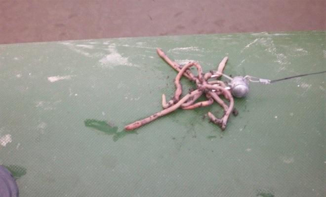 Затем начинаешь руками разбирать ил и собирать добычу. Пойманных миног в бутыль с водой.