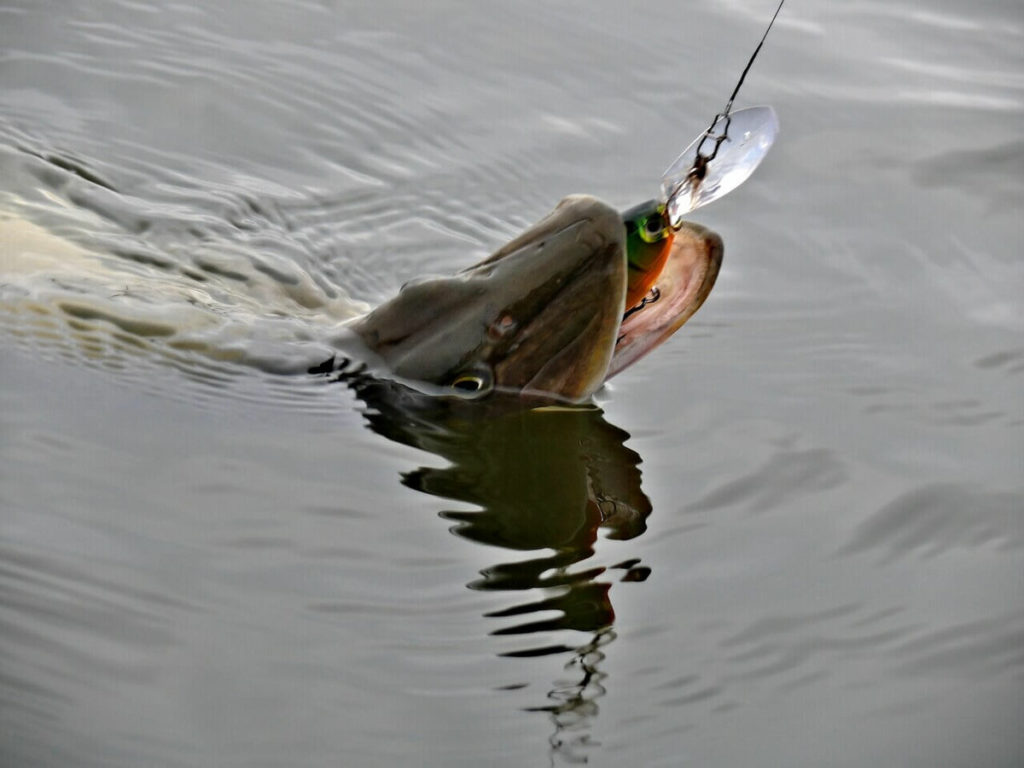 Во время жора щука раскрывает свое присутствие всплесками. Она гоняется за добычей, но по-прежнему осторожна. Проводка приманок в это время используется более энергичная.
