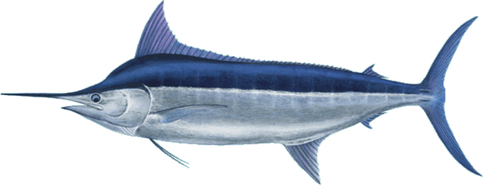 - Синий марлин, или голубой, имеет способность менять оттенок при охоте. Спина темно-синяя с характерными полосами, живот цвета серебра, плавники темные, высокие, гибкие, заправляются в специальный отсек на спине.