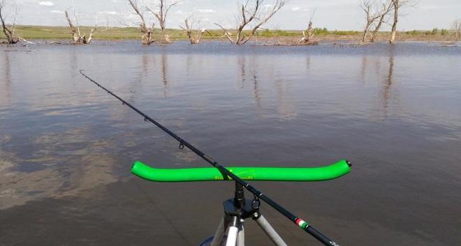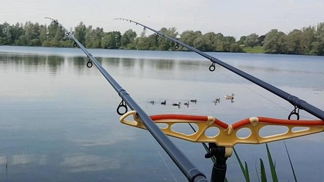 - Заброс оснастки и установка удилища. При этом расположение подставок должно быть таким, чтобы хлыст находился под углом к урезу воды в 45 градусов.