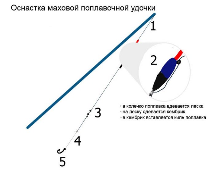 Оснащена эта удочка традиционно: поплавок, леска, грузило, крючок.