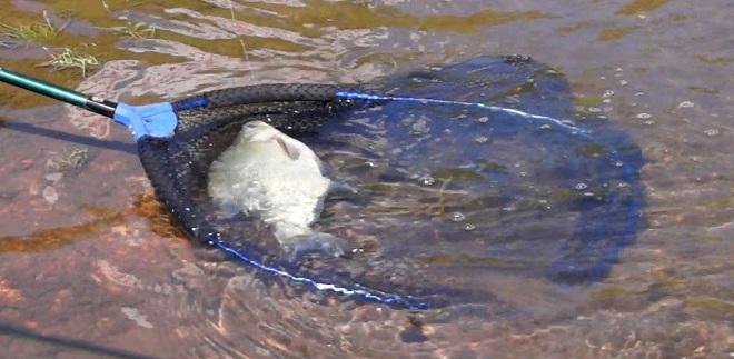Когда она выбьется из сил нужно подвести её к берегу и взять в подсак.