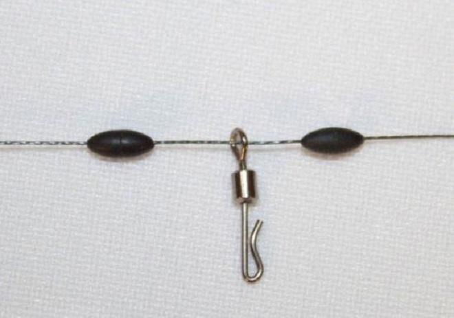 - На рабочую леску монтируем последовательно стопорные бусины, вертлюжок, и снова стопоры.