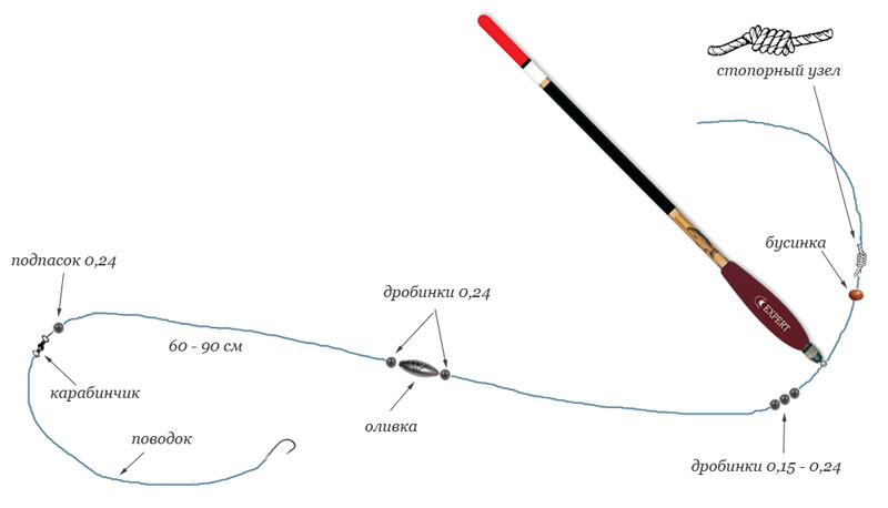 - на конец основной лески надевается стопорный грузик — дробинка весом 0,02−0,04 гр;