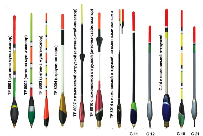 Существуют поплавки для дальнего заброса с телом в виде эллипса, у которых есть сменные антенны, которые фиксируются в теле поплавка. Они отличаются различной длиной, грузоподъемностью, расцветкой.
