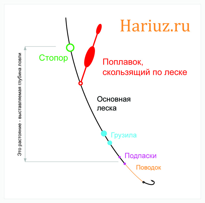 Эта оснастка позволяет доставить наживку с дальним забросом на нужную глубину, контролируемую поплавком. В отличие от донки, стопоры оснастки позволяют наживке не только находится на дне, но и зависать над дном, что важно для ловли, например, речной сельди на Волге или Днепре. Сельдь со дна не берет и держится чаще возле фарватера.